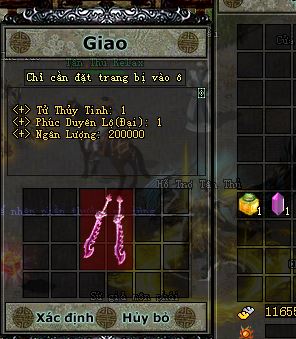 1 Tử Thủy Tinh + 1 Lam Thủy Tinh + 1 Lục Thủy Tinh + 20 Tiền Đồng + 100 vạn lượng