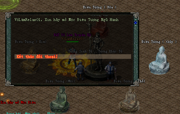 Tương sinh tương khắc Có 5 tượng phật ngũ hành. Click vào con NPC tương sinh và tương khắc sẽ ra lần lượt các câu hỏi. Lưu ý câu hỏi hơi khó hiểu nhưng chung quy không có chữ tất cả là tương Sinh (ví dụ Kim sinh gì? ), có chữ tất cả là tương Khắc (Ví dụ Kim khắc gì), trả lời đúng liên tục 20 câu là qua ải.